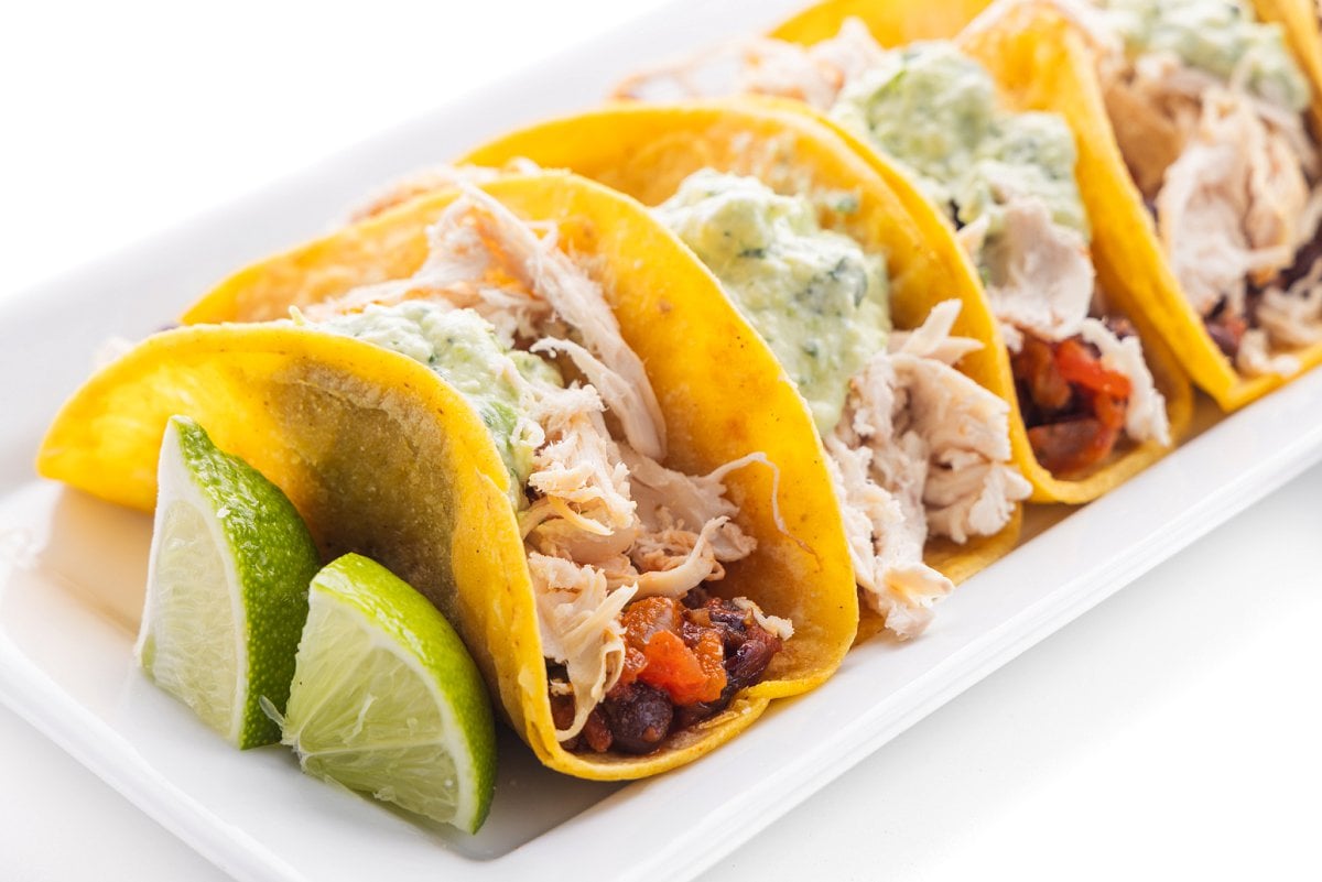 - To make tacos, top each with a little of the black bean salsa mixture then top with shredded chicken and finish with a dollop of the avocado yoga crema. Garnish with extra lime juice and cilantro.
