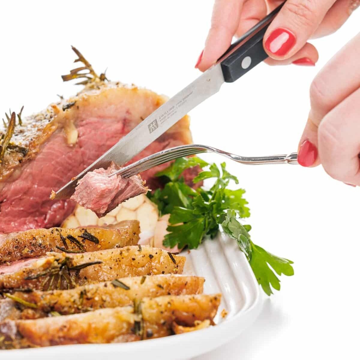 Serve with additional fresh herbs along your favorite sides – I like to serve mine with a side of warm hummus with lamb and pomegranate! Enjoy your Garlic and Rosemary Studded Beef Roast!