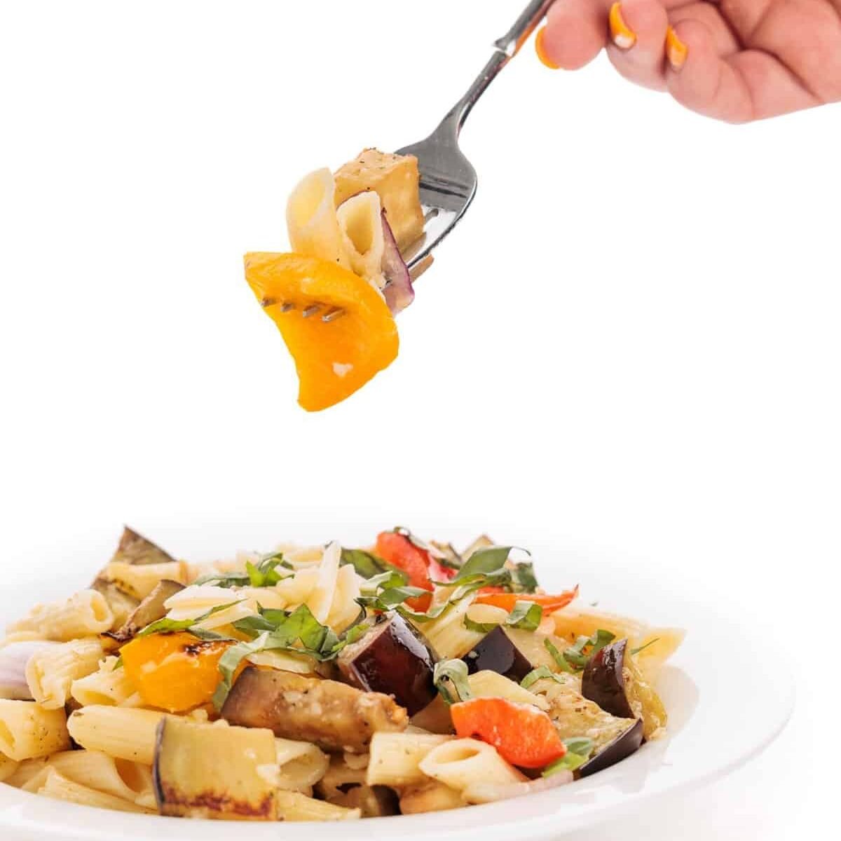 This quick and easy grilled vegetable pasta recipe is made with grilled peppers, eggplant, and onions tossed in olive oil, oregano, garlic, and Parmesan cheese. A great vegetarian dish!