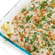 Lebanese Baked Fish with Tahini Sauce and Toasted Pine Nuts