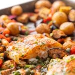 Mediterranean Baked White Fish with Potatoes, Eggplant, and Tomatoes