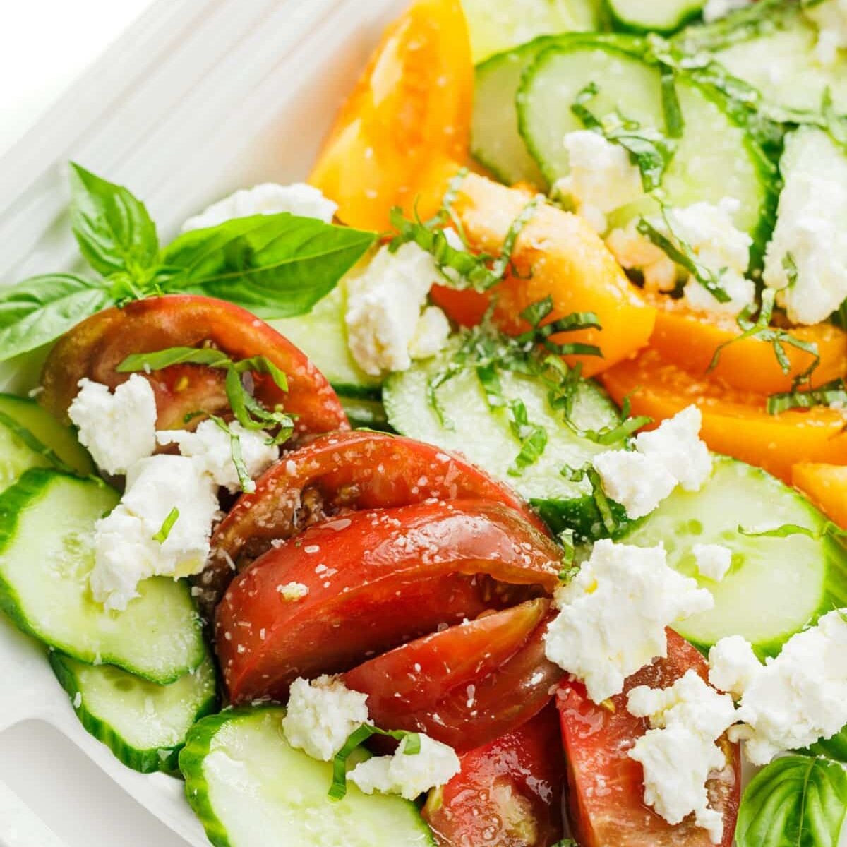 A simple salad made with ripe heirloom tomatoes, garden fresh cucumbers and creamy goat cheese is drizzled with olive oil and a plenty of fresh basil.
