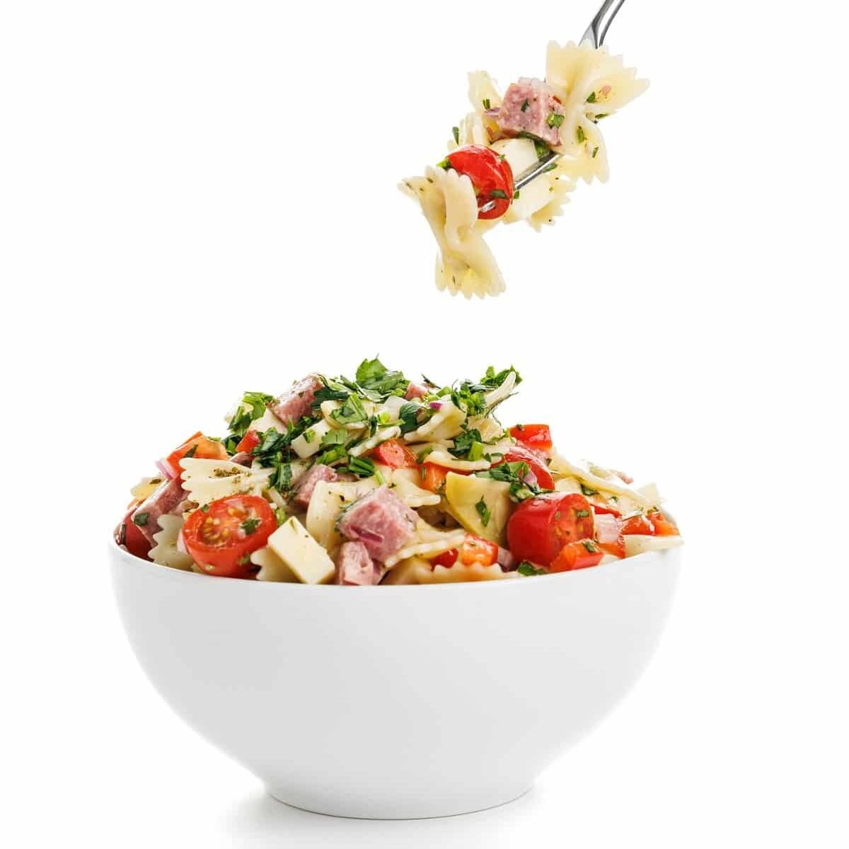 - Bowtie pasta: Fun and small, bite-sized pasta that mixes evenly with the rest of the salad.