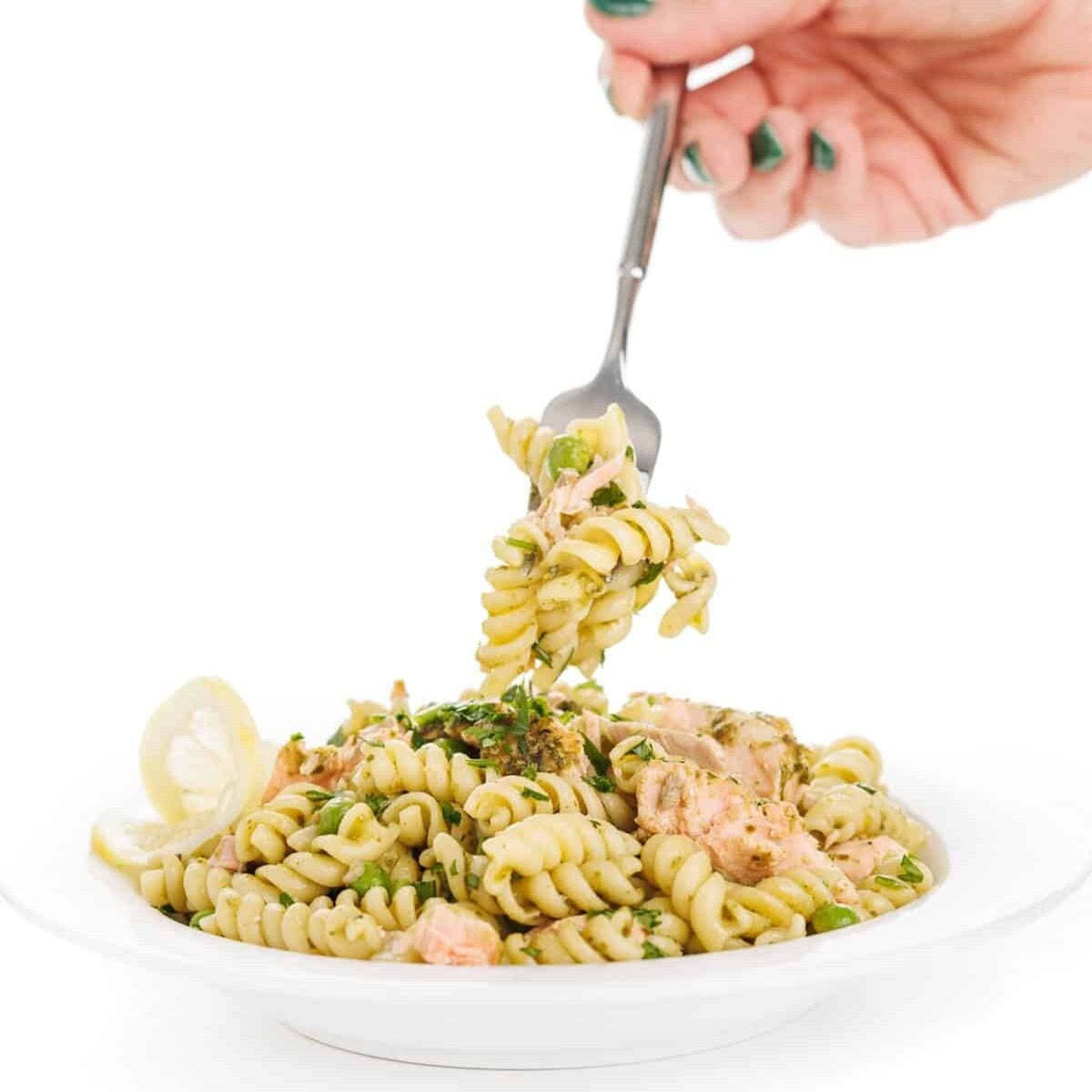 This easy pesto pasta with salmon and peas is is made with fresh pesto, roasted salmon, green peas, and a splash of bright lemon juice. Enjoy this incredible salmon pasta warm, cold, or room temperature.