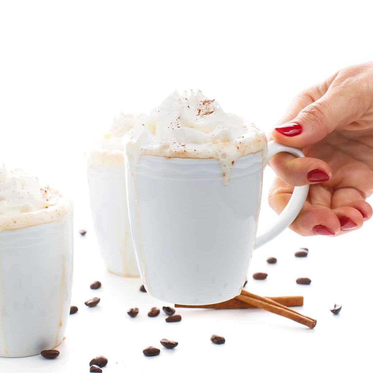 - Fill four coffee mugs halfway with coffee then top with the warm milk mixture. Garnish with whipped cream and a pinch of cinnamon if you wish. Serve immediately.