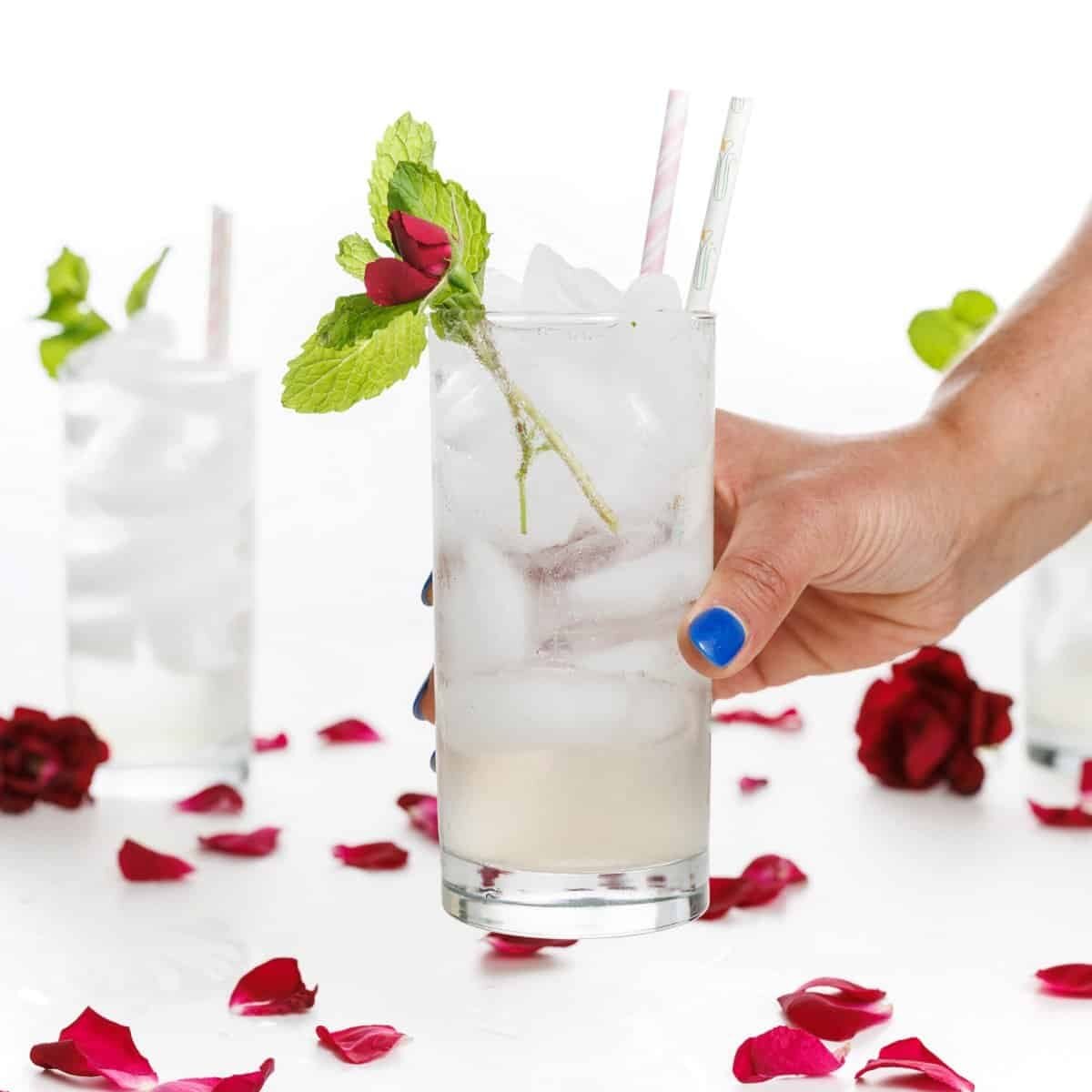 This refreshing rose water cooler is light, floral, and effervescent. Enjoy it as a mocktail or turn it in to a cocktail with vodka.