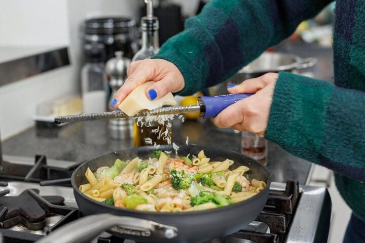 Step 8. Finish with the freshly grated parmesan cheese before tossing everything together, making sure it’s all evenly coated with the sauce and warmed through.