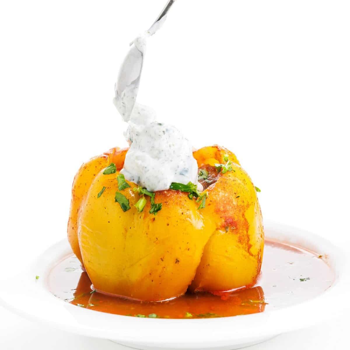 Once meat is cooked and rice is tender, remove from the pot and serve with a dollop of Lebanese Laban and fresh parsley. Enjoy your Stuffed Bell Peppers with Lebanese Spices!