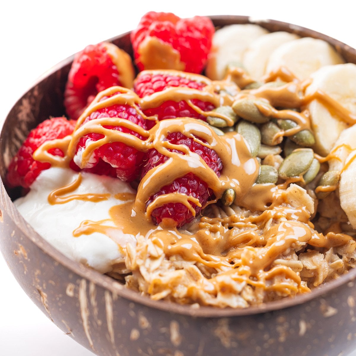 The best toppings (in my opinion) for oatmeal are peanut butter for protein, berries, oats, banana slices, chia seeds, almonds (or other nuts), or raisins.