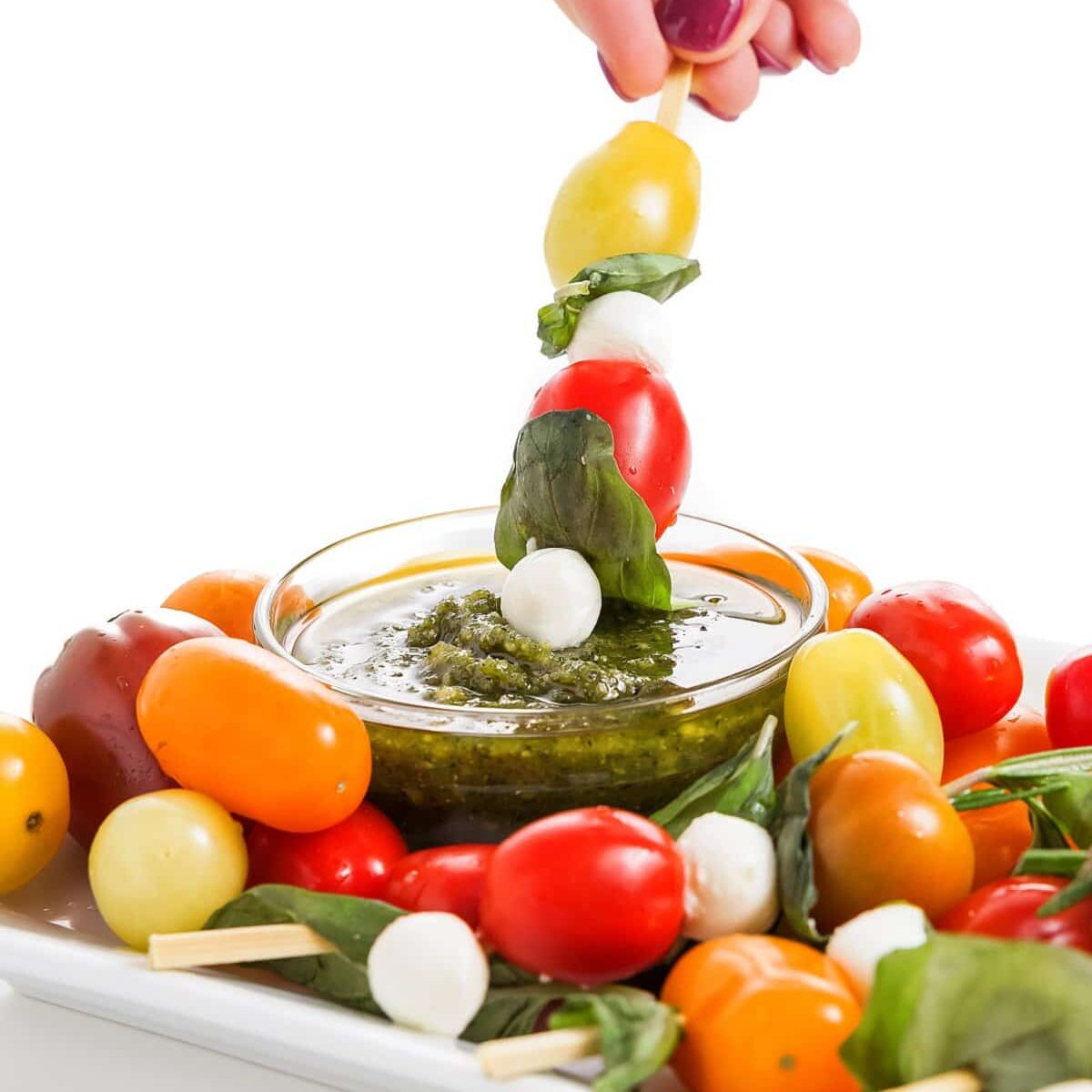 - To serve, place caprese skewers on a platter with pesto in a small bowl to act as a dipping sauce.