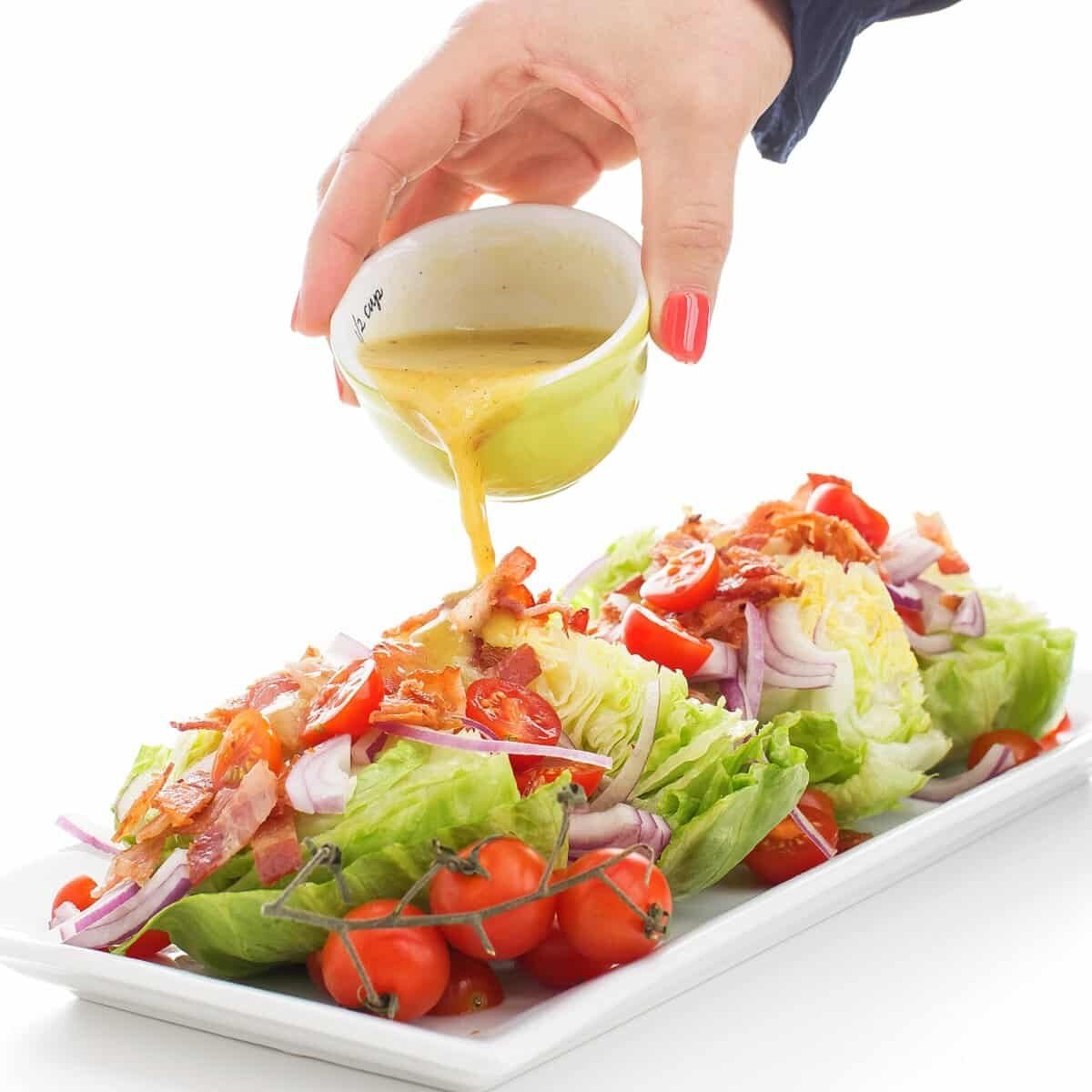 Salads are a staple in my diet, and are probably on your radar too if you’re looking to eat healthier, eat more greens, eat locally, and/or boost your macros. I have also found that even my kids enjoy eating salads because they’re never boring. Trust me – you do not have to eat boring salads. Make your own delicious and healthy dressings, experiment with different flavors and textures and have fun with it. I love this Wedge Salad with Bacon and Blue Cheese Vinaigrette as a way to shake up the typical tossed salad. And it’s great for hosting because you can prep the wedges in advance, and then just serve with the dressing on the side! No more soggy salads.