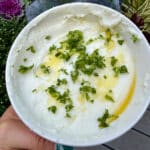 Turn the machine back on and slowly drizzle in the oil through the lid starting with 1/2 cup. After the first 1/2 cup has been added, pour in a teaspoon of the lemon juice.