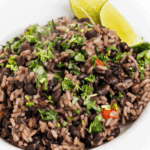 Use a fork to loosen the rice and bean mixture then serve with fresh cilantro and lime wedges.